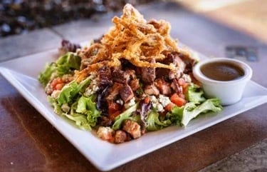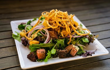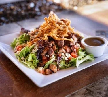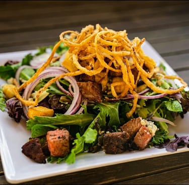New York Steak on a bed of Mixed Greens, Avocado, Cherry Tomato, Bleu Cheese Crumbles, Croutons, Onion Tanglers served with Balsamic Dressing